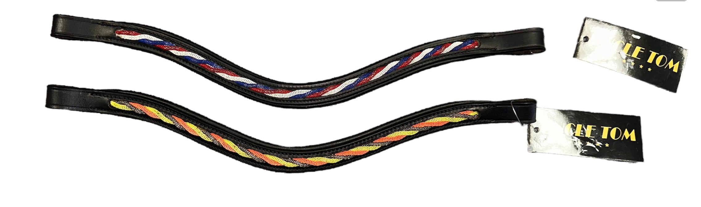 Fekete bőrből készült háromszínű zsínórszerű fonással díszített homlokszíj.