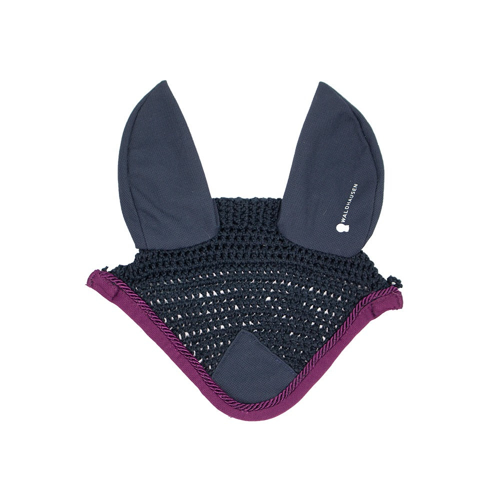 Sötétkék színű fülvédő lila szegéllyel és díszzsinórral.