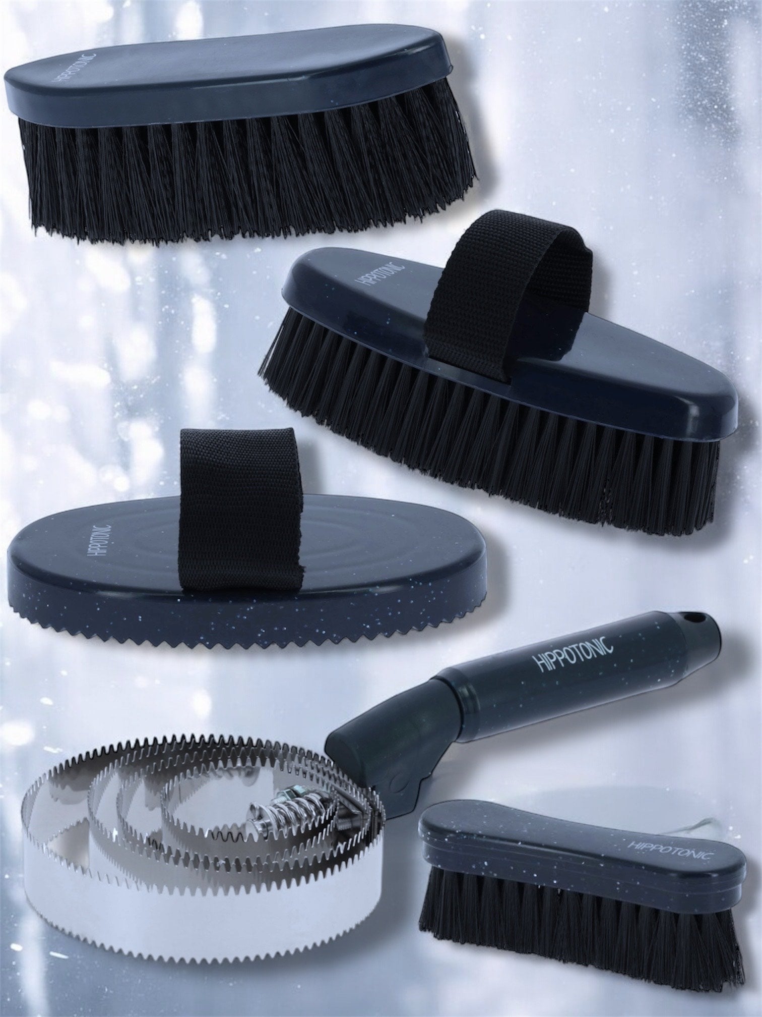 Sötétkék alapon ezüst glitteres ápoló eszközök a "Glitter" termékcsaládból.