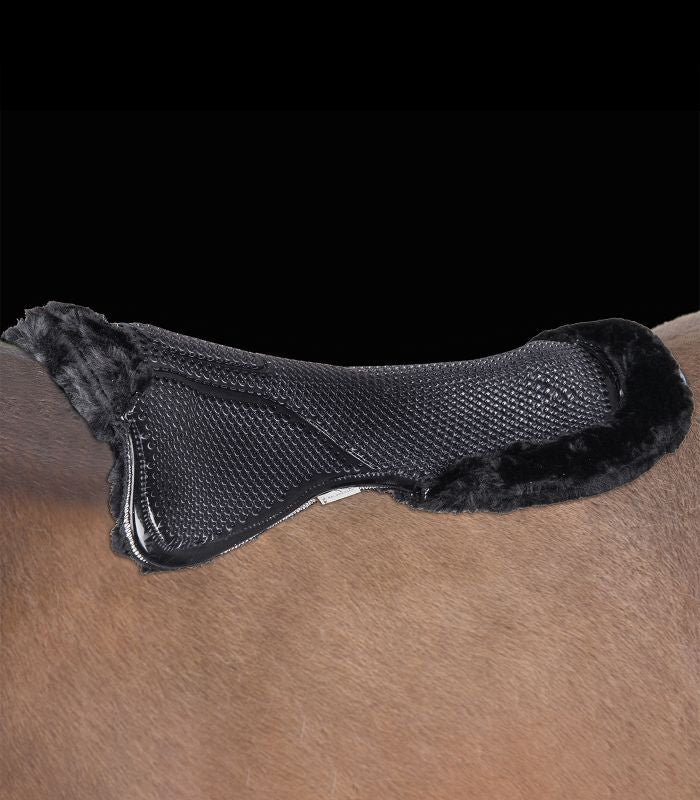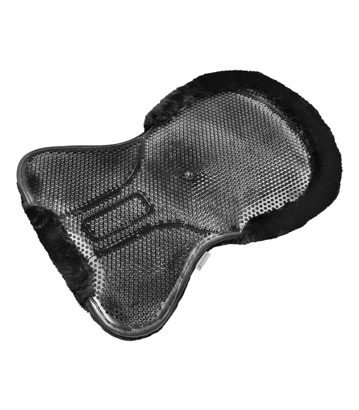 Kiváló minőségű gélbetét szintetikus bárányszőrmével. Jobb fogást biztosít, minimalizálja a nyomást, így tehermentesíti a ló hátát. Szintetikus bárányszőrmével bélelt az alján, elöl és hátul is. A gélrész szellőzőnyílásai optimális légáteresztést biztosítanak.
