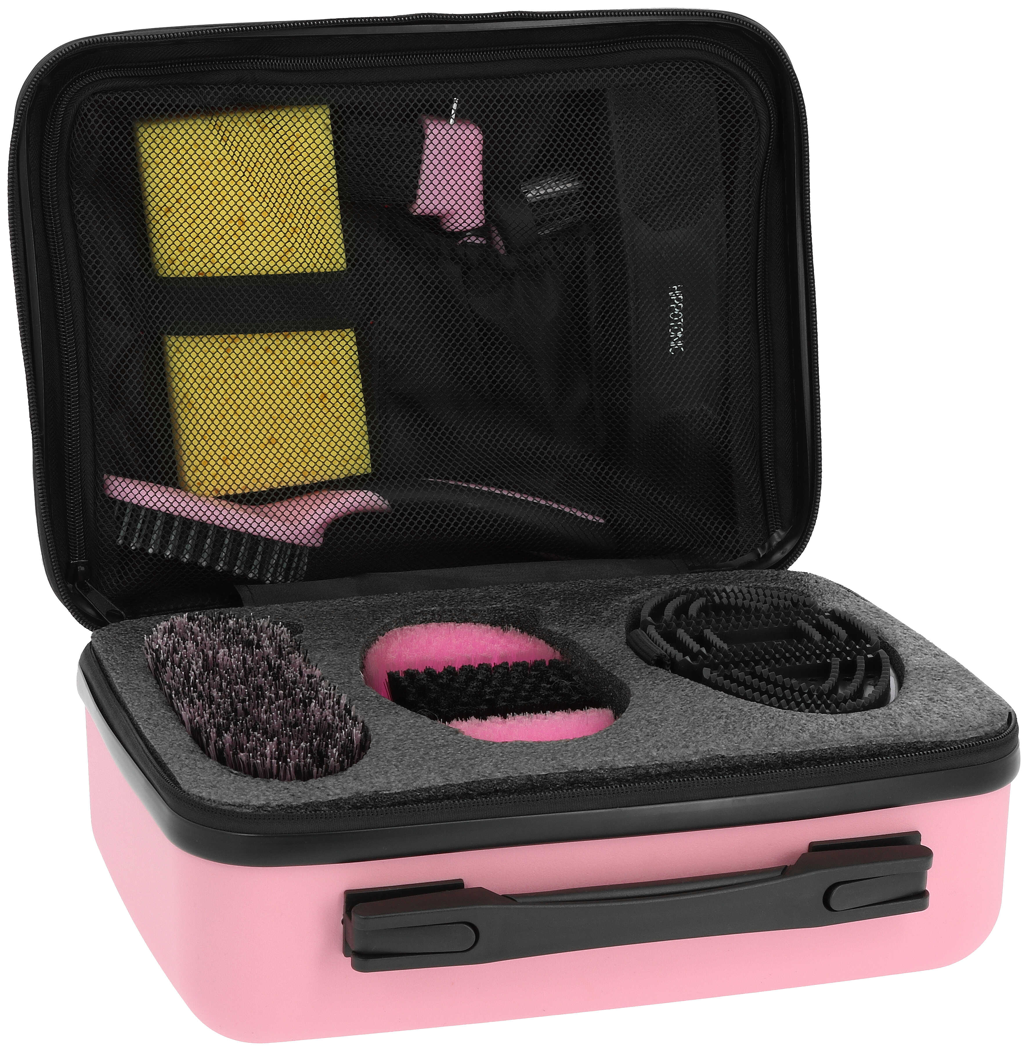 Teljes ápolókészlet. - Minden, amire szükséged van: Tartalmaz egy flexi kefét, dandy kefe, sörényfésűt, pofakefét, flexi vakarót, patakaparót kefével, szivacsot és multifunkcionális masszázskefét. - Sokoldalú: A tartós és könnyű, puha PVC tok kiüríthető és utazótáskaként is használható. - Vidám és játékos: Aktatáska stílusú dizájnnal és rózsaszín kiegészítőkkel.