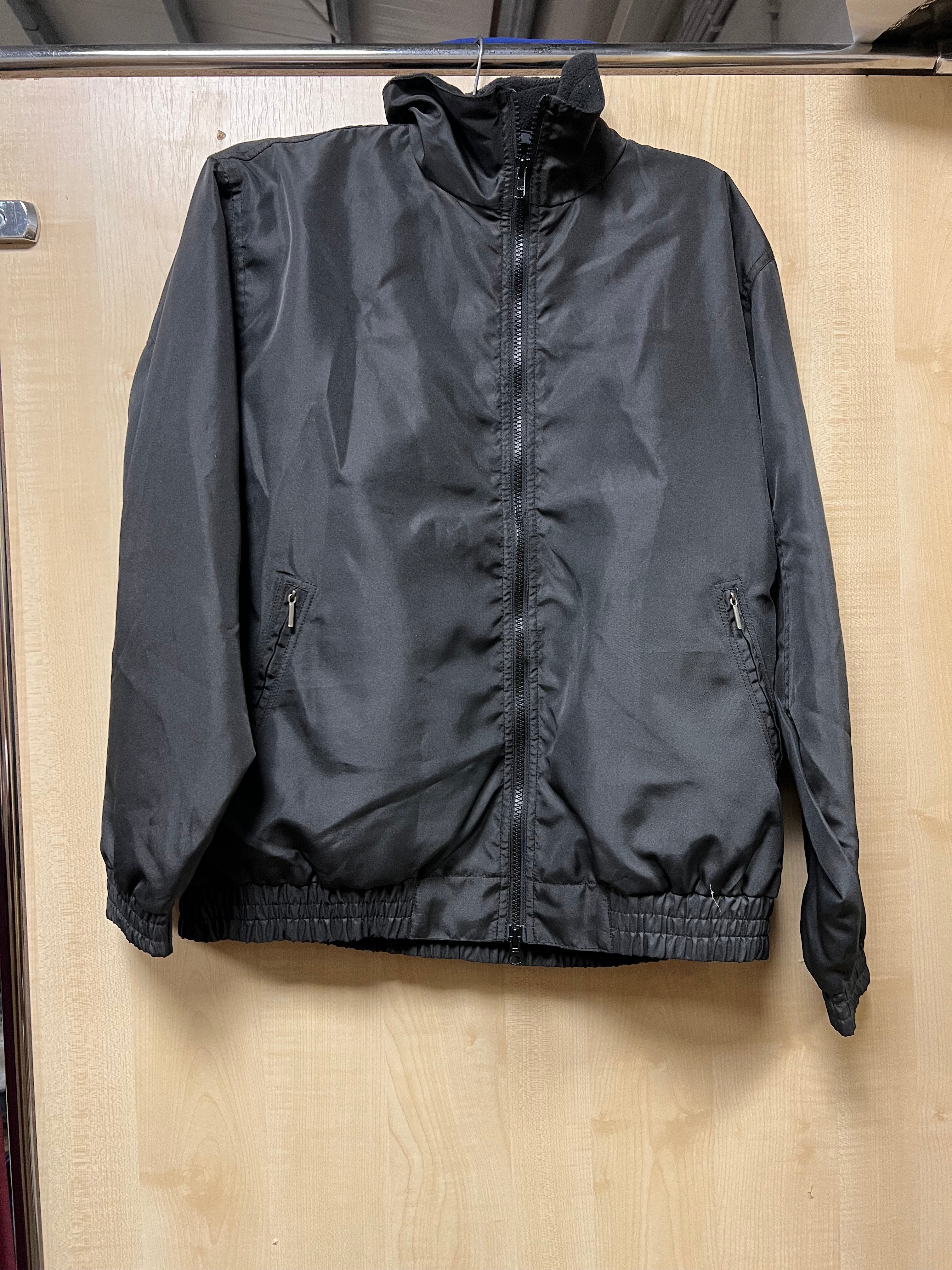 fényes anyagú, polárral bélelt kabát gumis derékkal és ujjvégekkel.