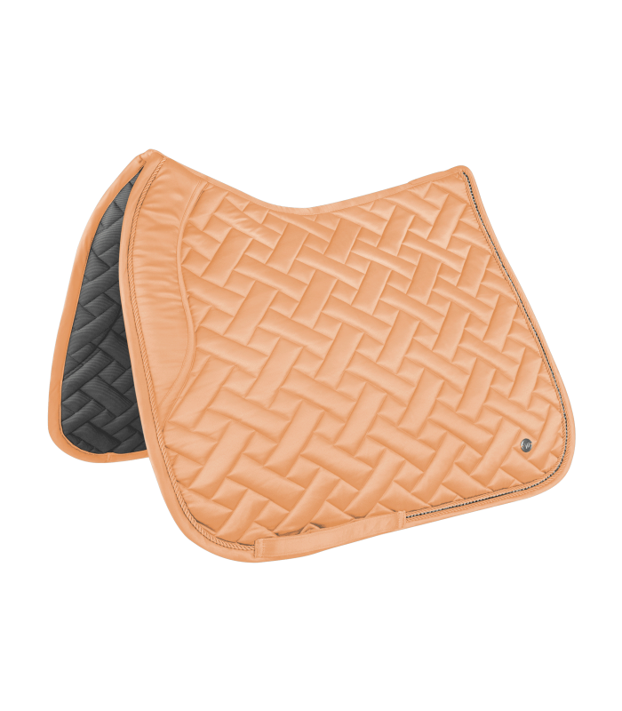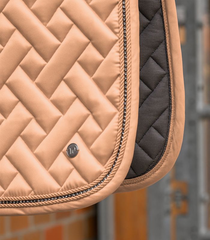Ez az elegáns nyeregvédő kiváló minőségű, fényes anyagból készült, hűsítő bambuszból és poliészter fonalból készült hálós béléssel rendelkezik az optimális nedvességszabályozás érdekében. A légáteresztő bambusz bélés antibakteriális és különösen kíméletes a bőrhöz. A két díszzsinór között csillogó strassz szalag és egy ezüst fémlemez teszi teljessé a dizájnt. A három rögzítőponttal ellátott hevederhurok biztonságosan a helyén tartja a dolgokat.