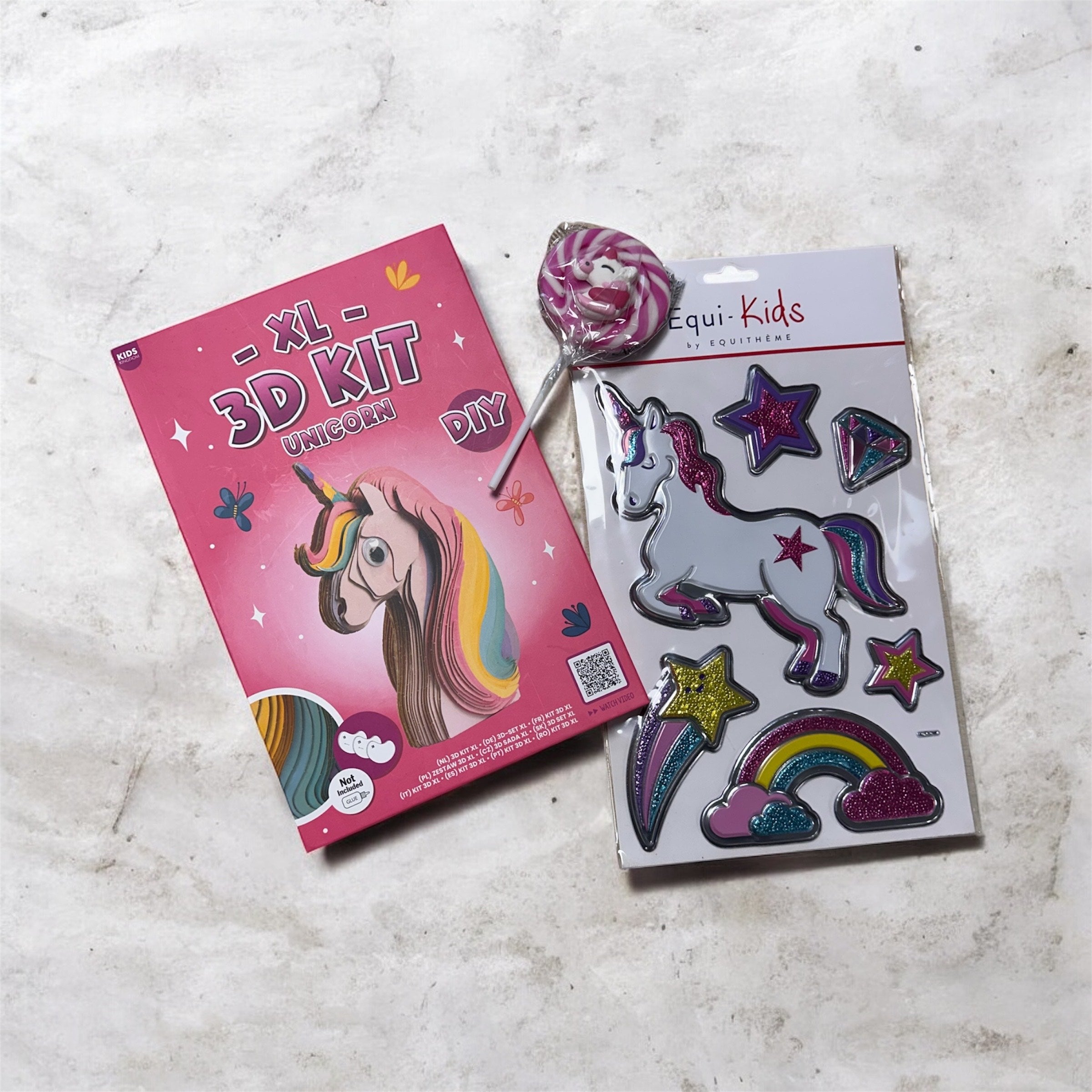 Fincsi nyalóka, 3 dimenziós csillogó marticaszett és 3D-s farostlemezból összerakható unikornis fej DIY módszerrel a szett tartlama.